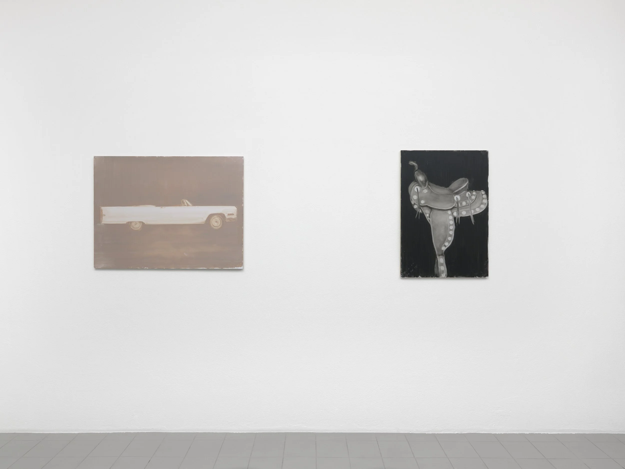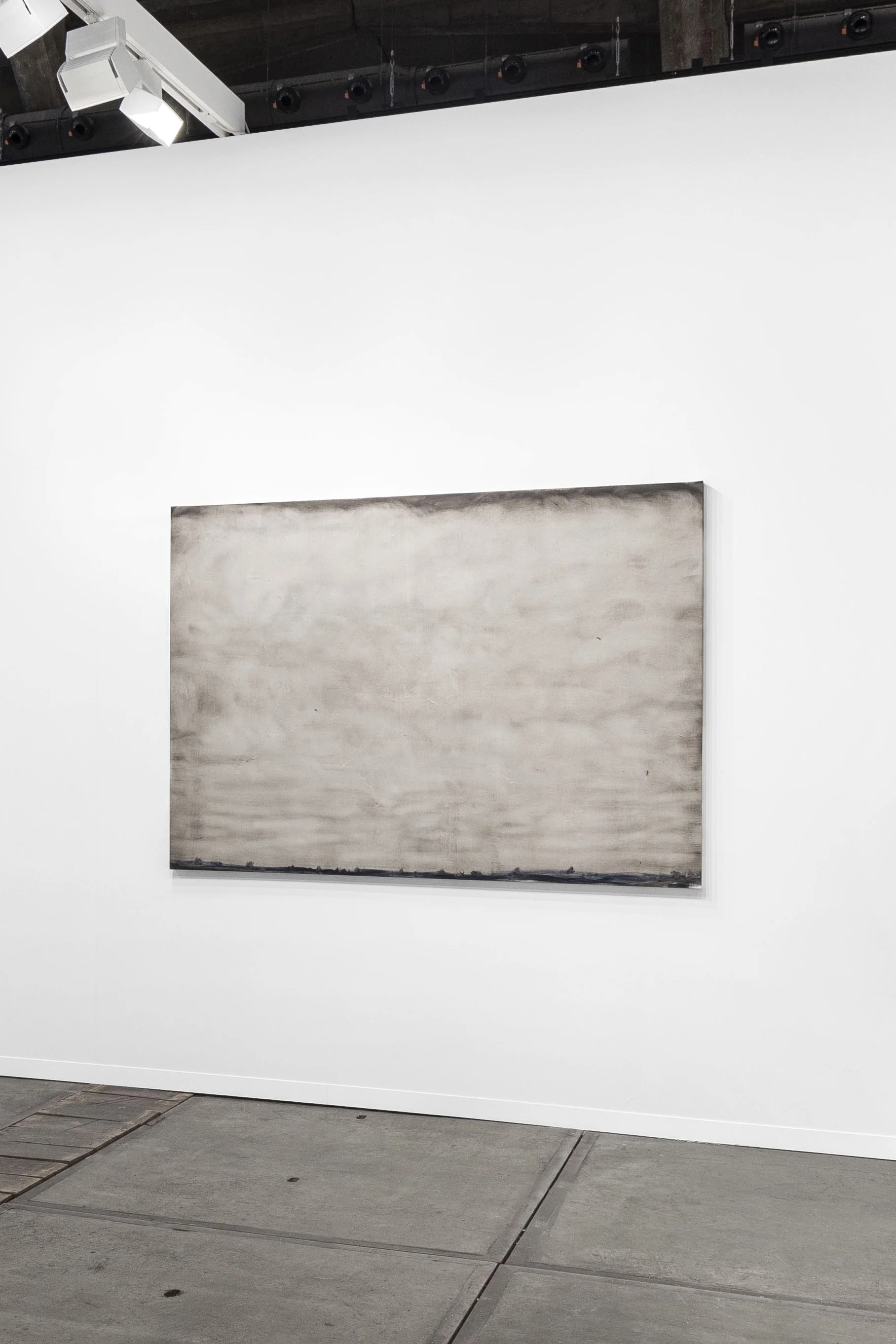 His figurative painting is almost exclusively monochrome. He uses a reductive technique where he covers the entire canvas with thick black oil paint and then wipes it off with his hands or a paper towel, bringing images out of the darkness. The result is a slightly evanescent effect, an enigmatic and texturally minimalistic painting.